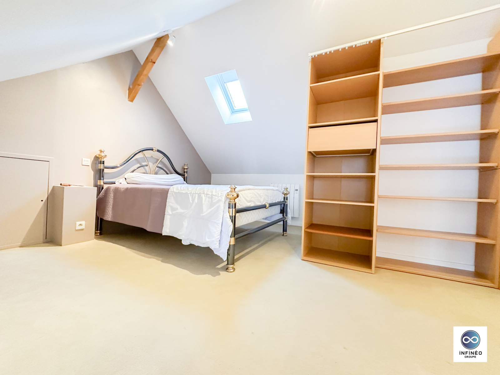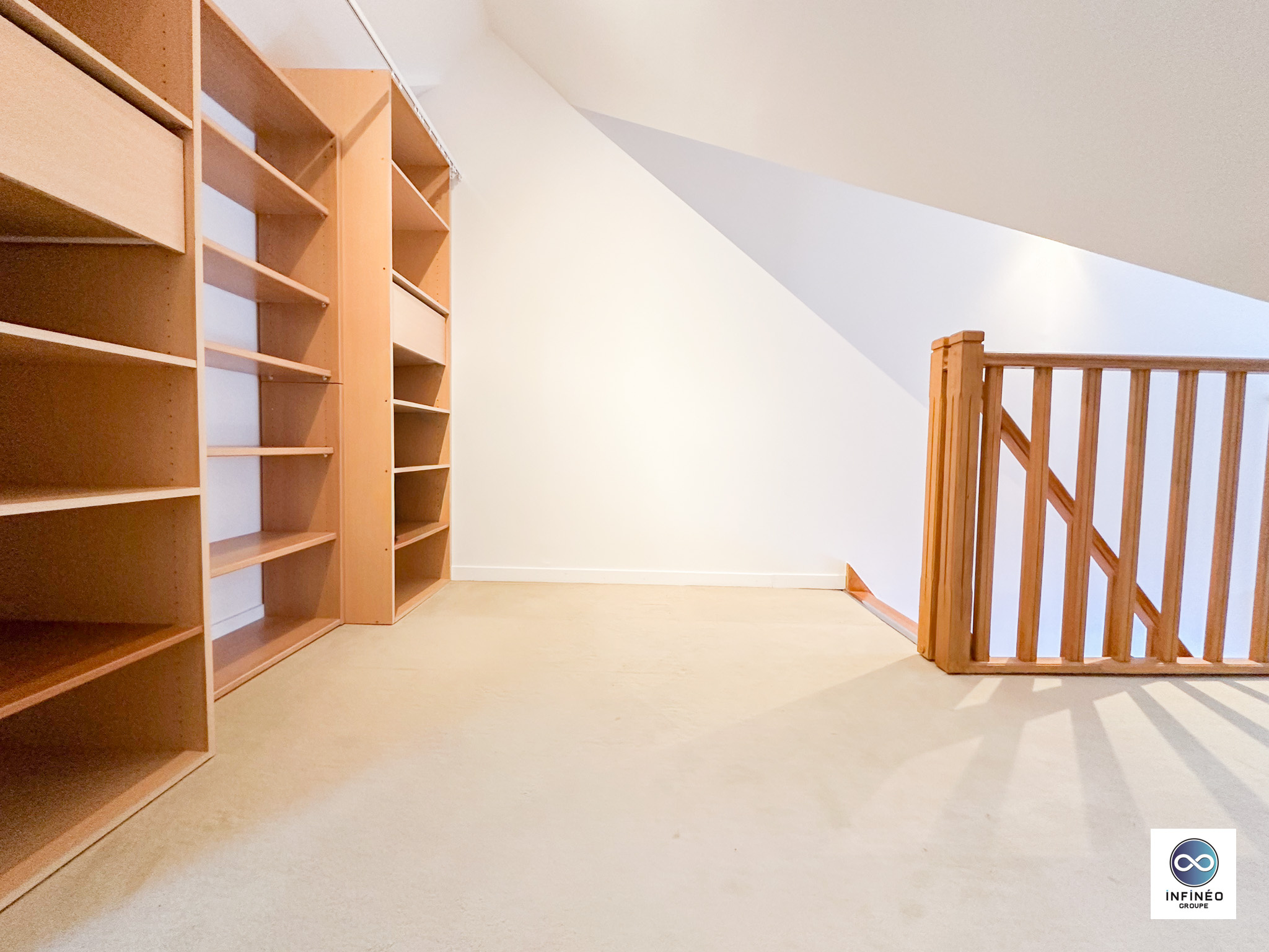 À l’étage, une mezzanine aménagée en troisième chambre offre un bel espace supplémentaire, parfait pour un bureau, une chambre ou un coin lecture sous les poutres. Un grenier est accessible pour plus de rangement.